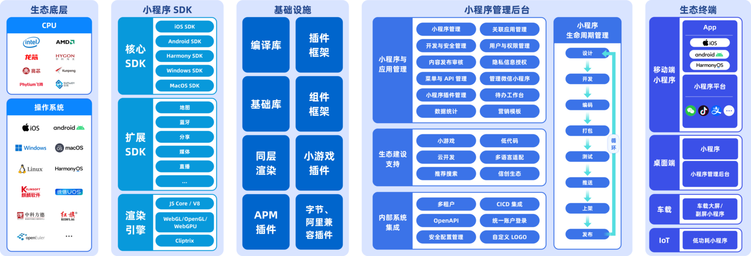 跨端协同与AI融合:小程序一次开发即可覆盖iOS、Android、鸿蒙及信创桌面终端,降低多端适配成本;通过MCP协议打通AI模型与业务系统,使通用大模型能调度企业内部功能,实现“对话即服务”。