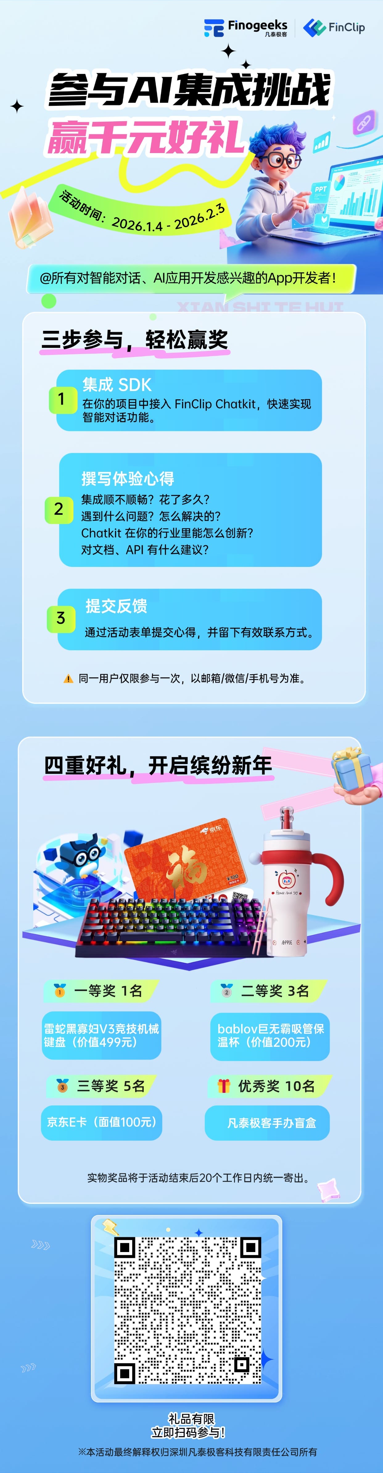 如果你也曾为此问题寻找答案,那么今天,这个解决方案来了!凡泰极客FinClip Chatkit邀请你亲身体验,参与即得好礼,优质反馈更能赢取千元机械键盘、京东礼品卡等重磅奖品!