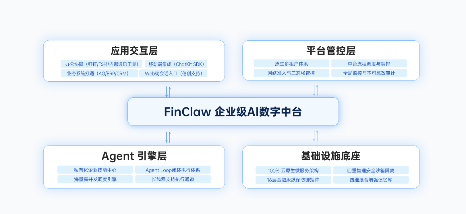 FinClaw企业级自主Agent平台,基于100%云原生与微服务架构构建,以单一服务器集群支撑海量多用户的并发调用,核心设计围绕"可管、可控、可协作、可扩展"四个关键词展开。