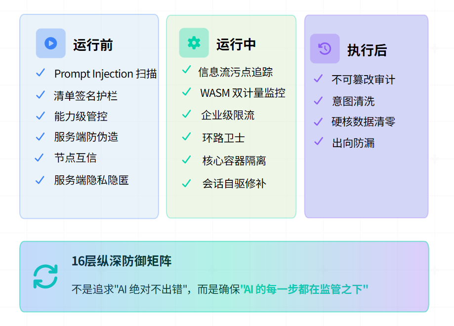 事前:提示词防注入与意图清洗,阻断恶意Prompt攻击;能力级管控,清单签名护栏。
