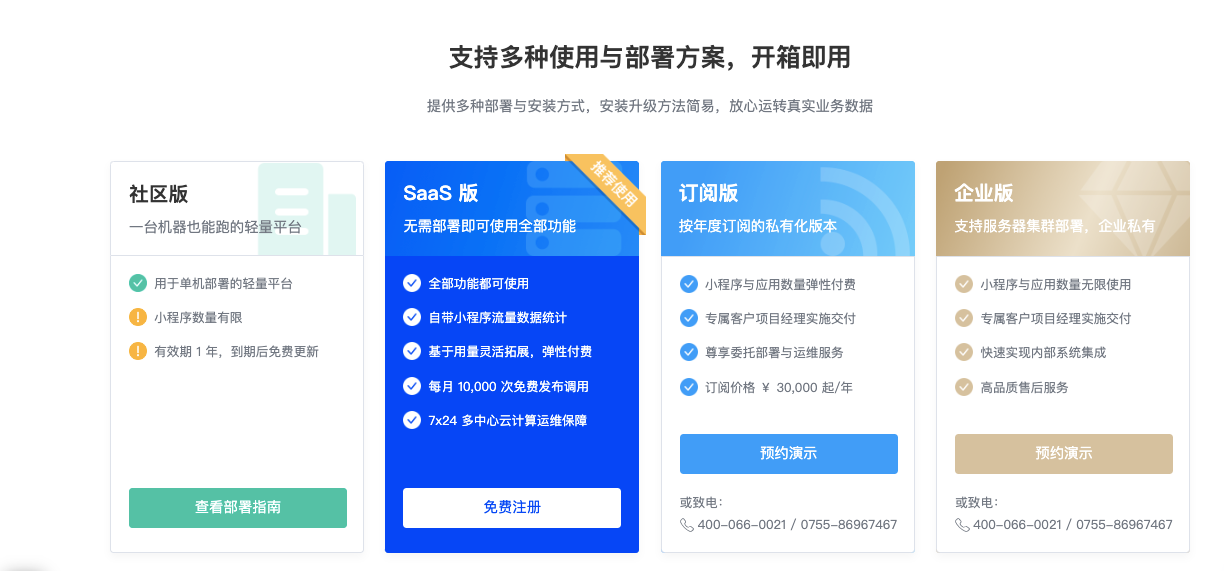 为了更好地满足不同场景与客户的需要,FinClip 分别针对中大型企业客户与开发者用户提供了 FinClip 私有化版,企业订阅版与 SaaS 版,企业客户可根据自身需要,通过选择私有化版或企业订阅版获得更加全面周到的支持响应与项目维护服务。