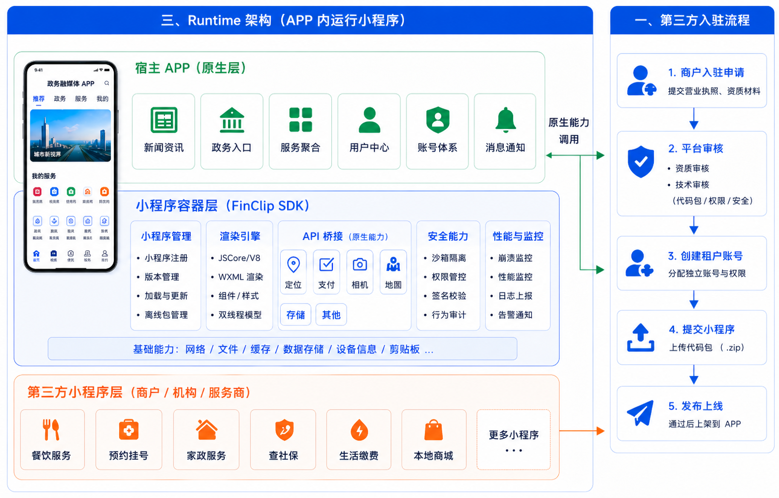│ 小程序容器层(FinClip SDK) │ ← 负责小程序加载、渲染、API桥接