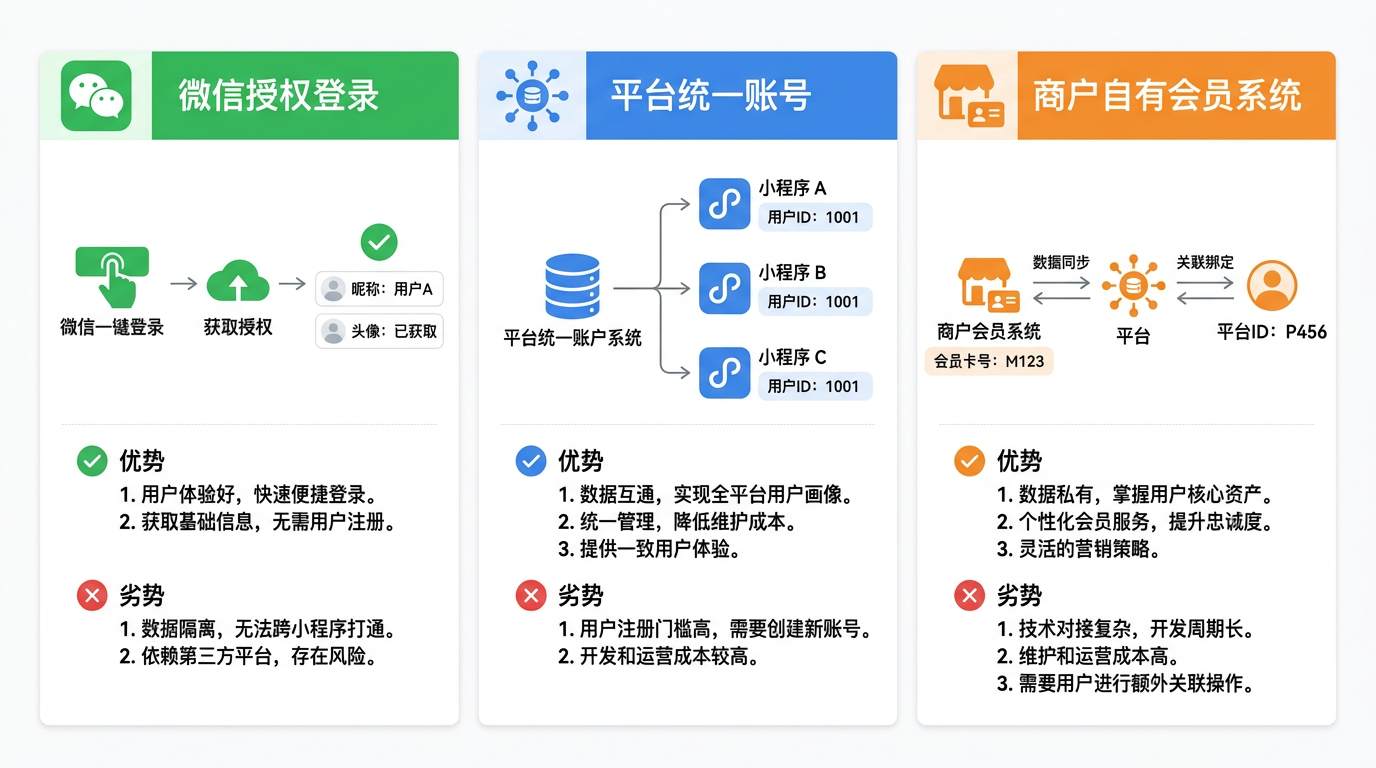 账号体系是第三方入驻场景里比较复杂的问题。商户入驻之后,用户在某个小程序里的行为记录归属于商户,不是平台方。同时,平台方也希望能识别用户在不同小程序里的身份,避免用户每次进不同小程序都要重新登录。