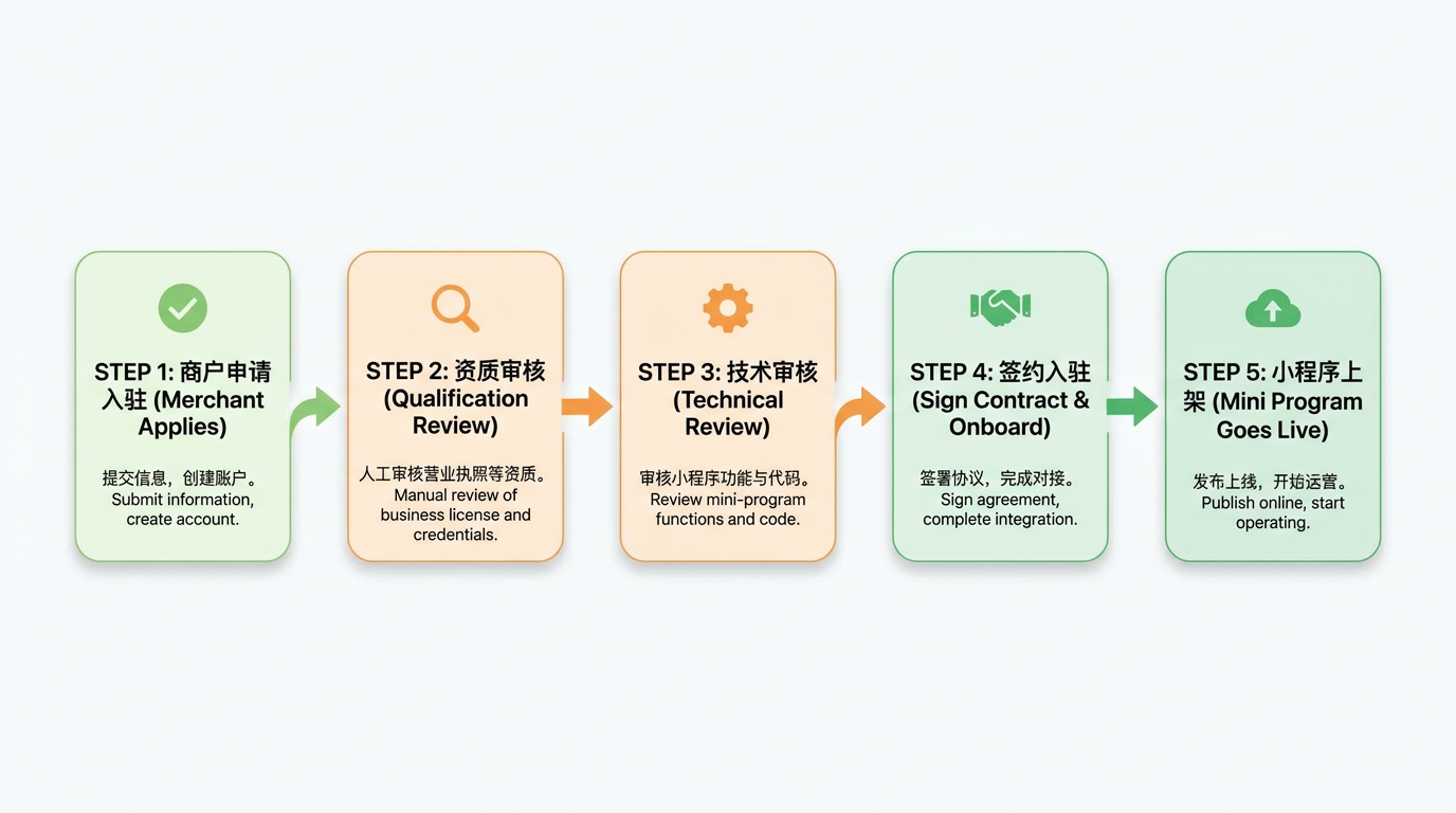 第二阶段是技术审核。商户提交小程序包之后,平台要检查代码包签名是否有效、manifest声明的权限是否合理、有没有明显的数据外传行为、隐私协议文档是否合规。审核通过后,商户的小程序才会在APP里展示。