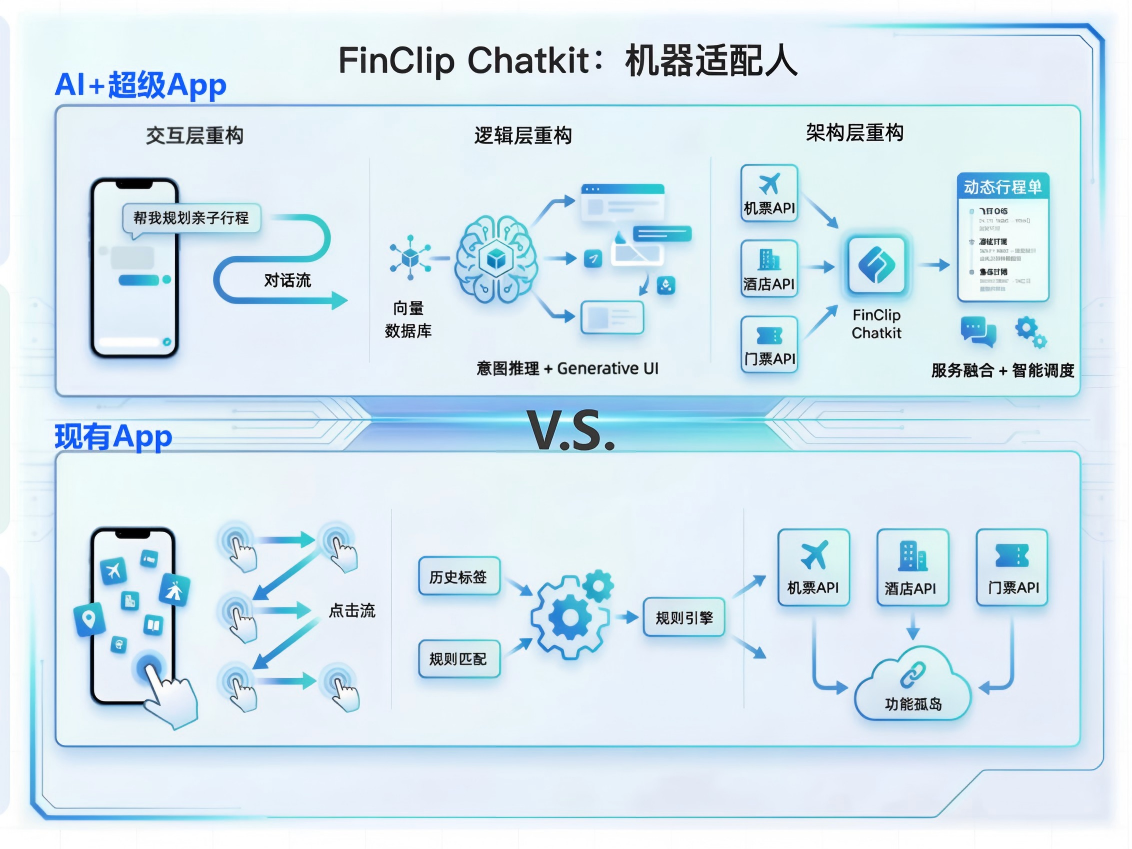 FinClip ChatKit 的核心设计理念,正是为了终结这种“寻找”的困境。它通过 “深度上下文感知”与“流式生成式UI”两大核心能力,将App从一个被动的“功能仓库”,转变为一个主动的“智能服务体”。