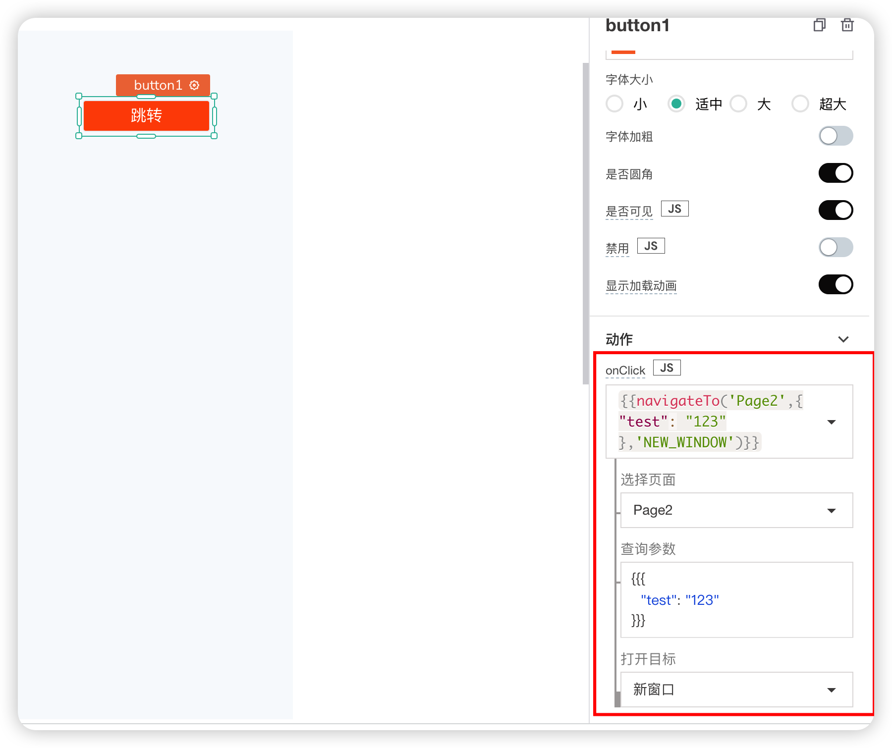 该事件允许用户在应用程序的内部页面或外部URL之间导航。它可以在任何小部件操作上触发,如Button的onClick, Dropdown的onOptionChange等。在navigateTo函数中输入页面名称或外部URL(在onClick等触发操作下),如果需要,输入Query参数,并为新页面(新窗口或相同窗口)选择目的地。