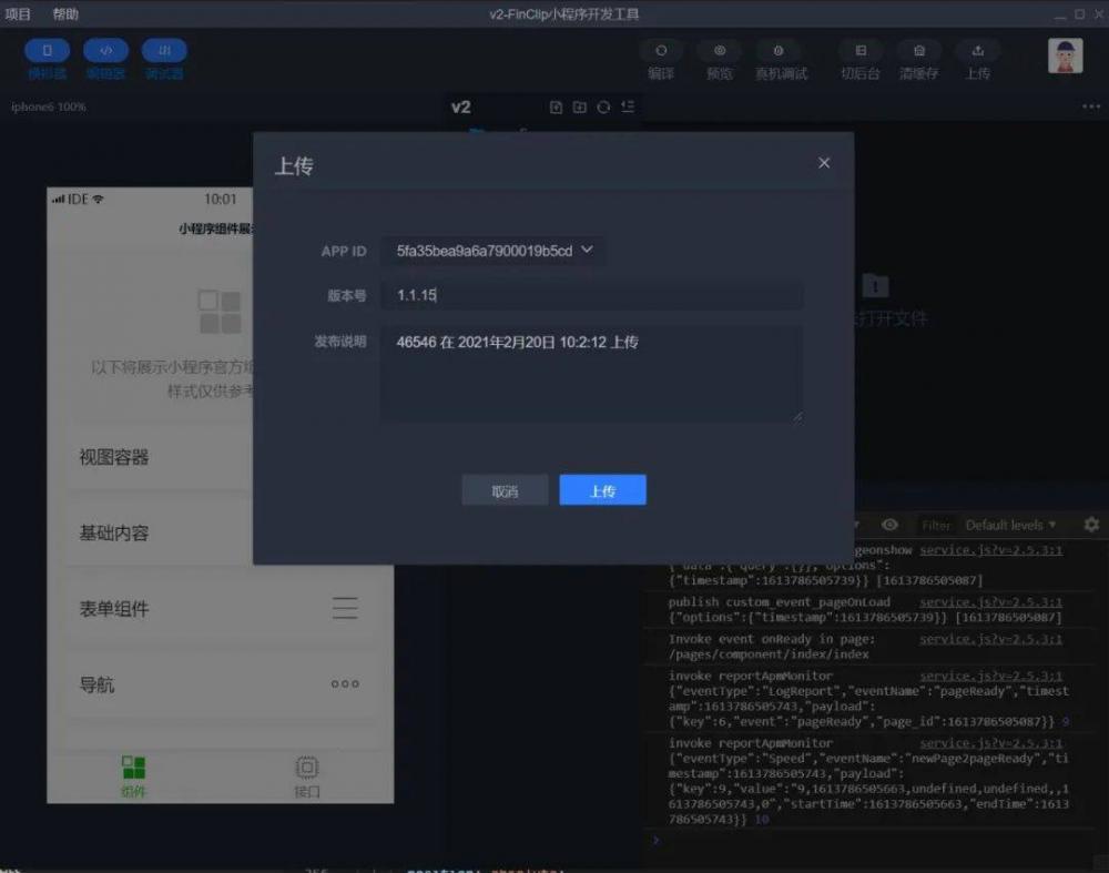 5、FinClip IDE可与 FinClip 服务端打通,可直接将编译好的小程序上传至后台
