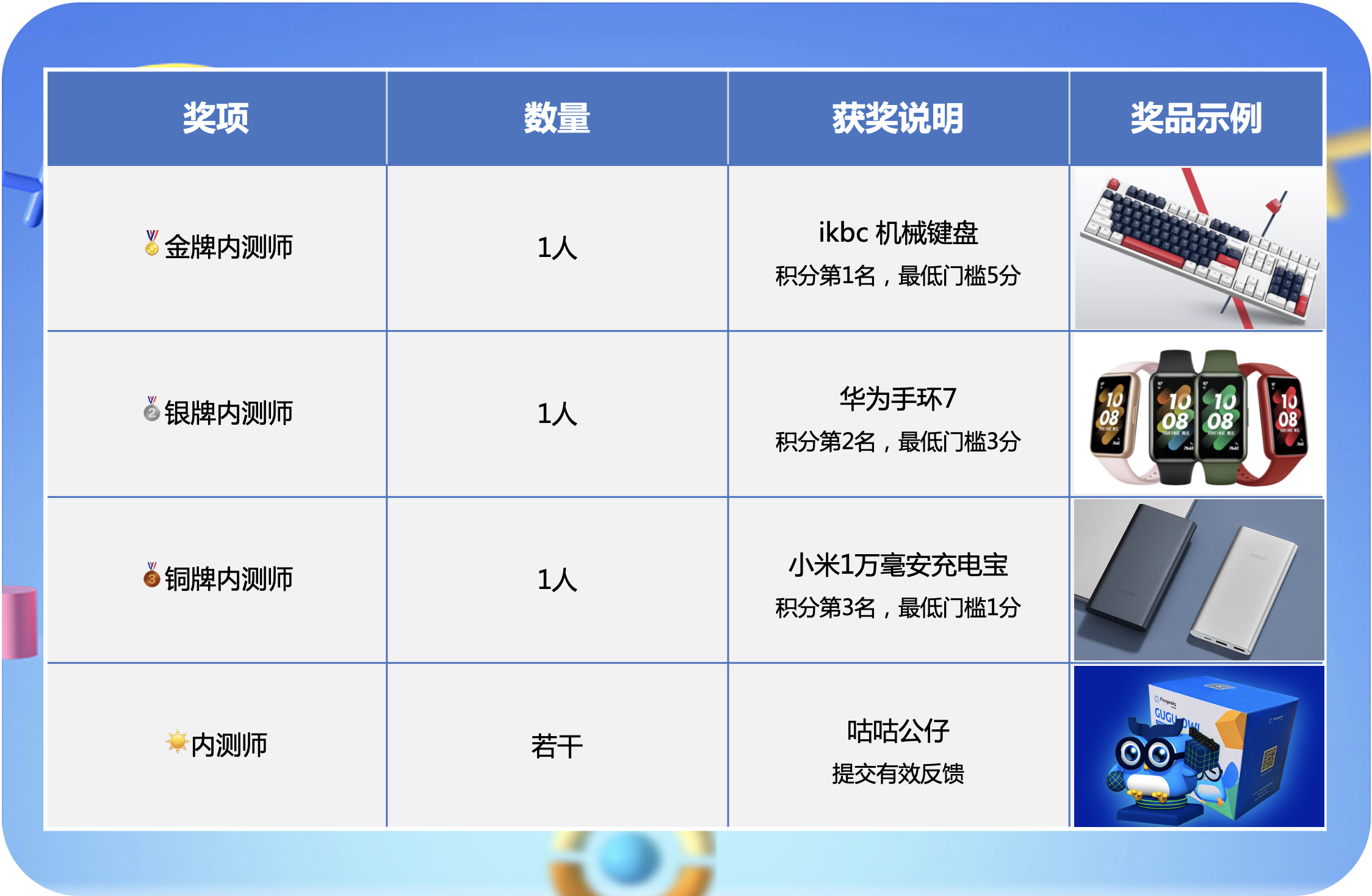 2、最后根据分值的高低评选:金牌内测师 *1人、银牌内测师 *1人、铜牌内测师 *1人、参与奖若干,参与奖为有贡献的开发者都可获得的奖项,以上奖励不可重复获得,每周三、五更新一次有效建议/bug积分榜。