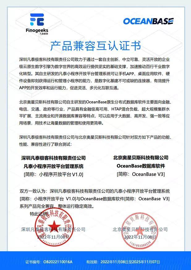 12月,「凡泰小程序开放平台管理系统」(小程序开放平台 V1.0)与北京奥星贝斯科技有限公司「OceanBase数据库软件」(OceanBase V3)完成产品兼容互认证。双方一致认为,凡泰极客「凡泰小程序开放平台管理系统」(小程序开放平台 V1.0)与OceanBase数据库软件(OceanBase V3)系列产品完全兼容,整体运行稳定高效。