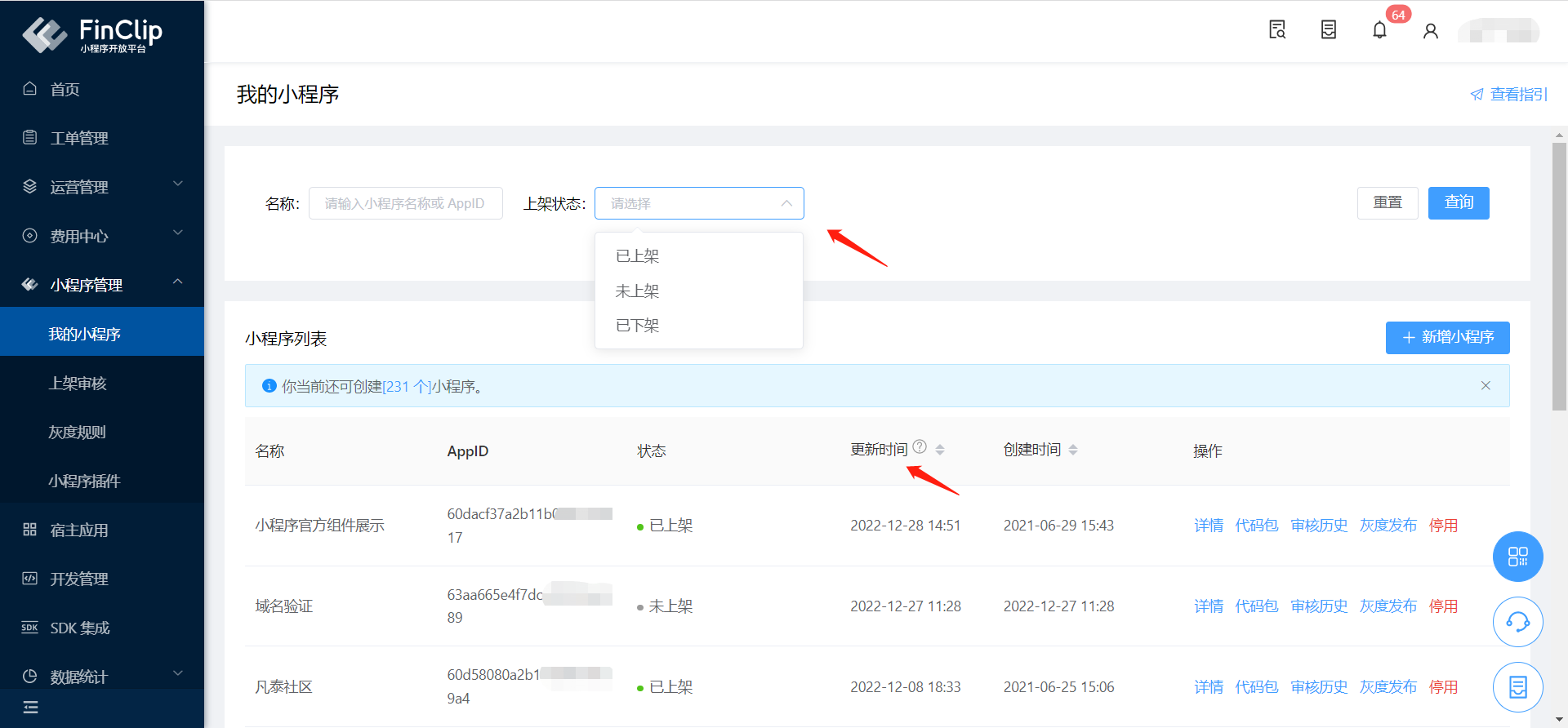 考虑到 FinClip 的用户在管理平台上创建小程序增多,为了管理更加方便,我们在原有小程序创建列表中,增加了按照“状态”筛选功能,同时增加“更新时间”标识小程序状态的变化,并提供排序功能。以此让开发者用户们,能更快更方便的关注到自己上线和发布的小程序。