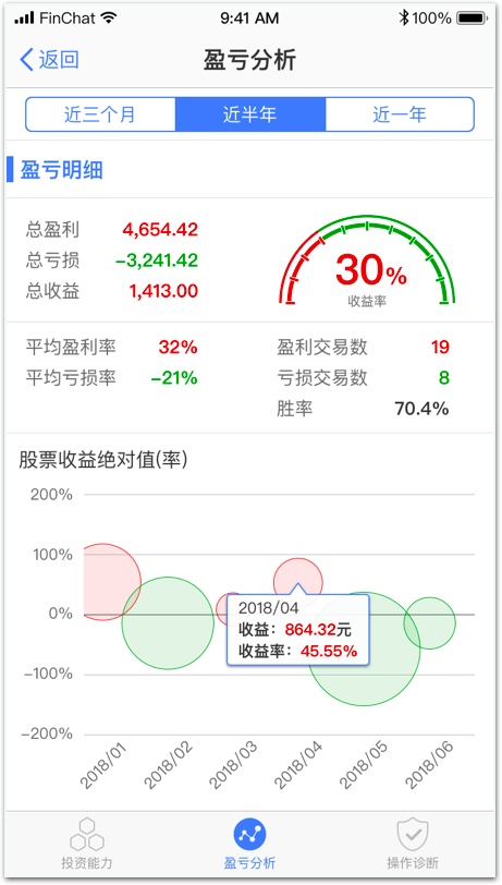 综合每笔交易的收益情况,给出收益/损失的统计结果,帮助投资者回顾自己的交易历史和细节。气泡图方便从多个维度了解投资的成绩:圆心的横坐标为日期,纵坐标为收益率大小;直径代表收益绝对值,直径越大收益/亏损金额越大;颜色区分盈亏,红色为盈利,绿色为亏损。