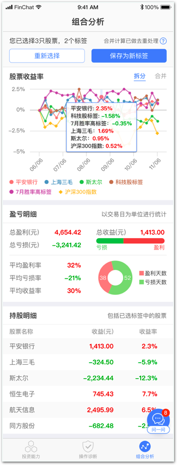 为了帮助投资者跨过这段距离,凡泰极客科技旗下的Sigma孕育了第二个功能模块:自主分析。这个模块将分析的选择和决定权交还到投资者手中,协助他/她更好地琢磨自己,从而获得更可观的投资收益。具体说来,模块的功能可以分为三块:组合分析、交易回顾和盈亏分析。投资者可根据自主选择,查看选定时间段持仓过的股票盈亏情况及持仓明细。还可以同时选择多个股票自定义资产组合,综合分析多支股票的收益情况,并保存为自定义标签,与其他股票和组合做交叉对比。让投资者可以完全自主地分析和使用自己的投资数据。