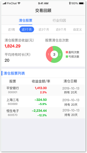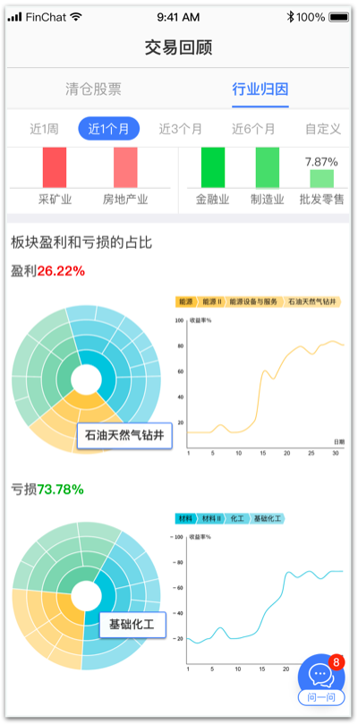 通过可视化分析工具,投资者可以自主地重演交易历史,从中找出盈利和亏损的原因,包括: 清仓股票、行业归因两部分。清仓股票模块统计指定时间区间内的已清仓股票,可查看每一次清仓的收益结果;行业归因展示指定时间区间内收益、收益率最好、最差的几个行业,同时可查看盈利、亏损在每一级行业分类中各行业的占比,以及收益率变化曲线。